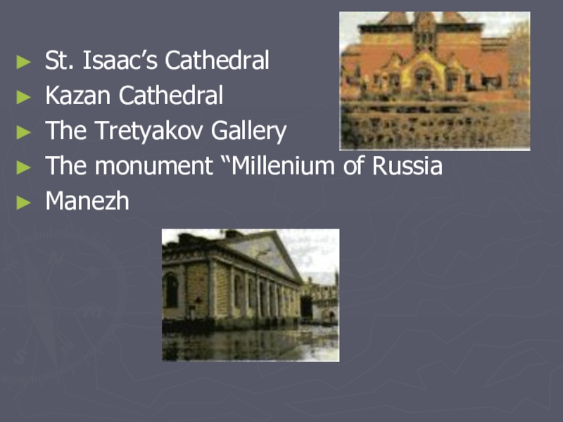 St. Isaac’s CathedralKazan CathedralThe Tretyakov Gallery The monument “Millenium of Russia Manezh