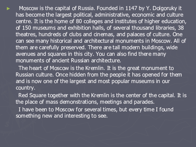 Moscow is the capital of Russia. Founded in 1147 by Y. Dolgoruky it has become the