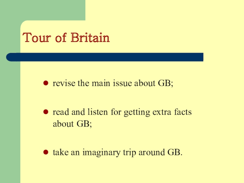 Tour of Britainrevise the main issue about GB;read and listen for getting extra facts about GB;take an imaginary trip around GB.