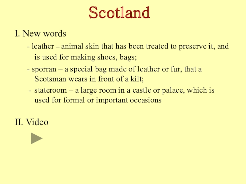 ScotlandI. New words- leather – animal skin that has been treated to preserve it, and is used