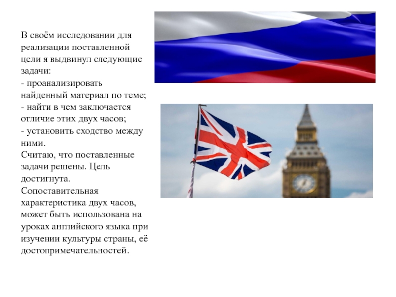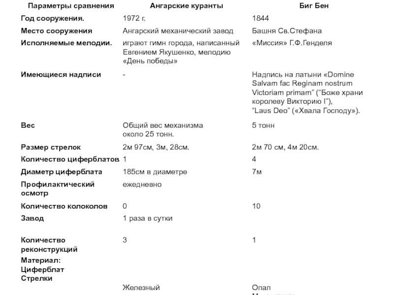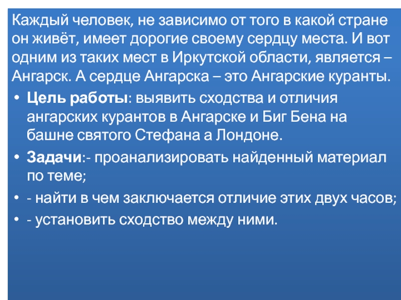 Цель работы: выявить сходства и отличия ангарских курантов в Ангарске и Биг Бена на башне святого Стефана а Лондоне.
