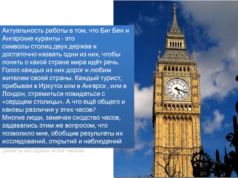 Актуальность работы в том, что Биг Бен и Ангарские куранты - этосимволы столиц двух держав и достаточно
