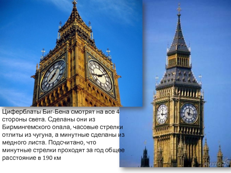 Слайд 5Циферблаты Биг-Бена смотрят на все 4 стороны света. Сделаны они из