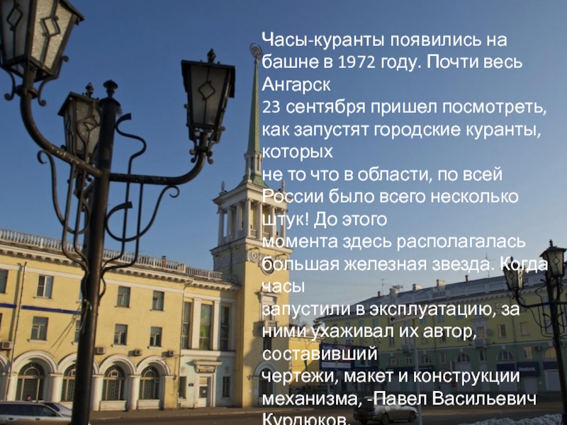 Слайд 4Часы-куранты появились на башне в 1972 году. Почти весь Ангарск 23 сентября