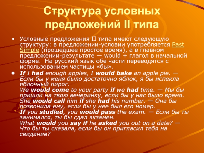 в предложении-условии употребляется Past Simple (прошедшее простое время), а в главном предложении-результате — would + глагол в начальной форме. На русский язык обе части переводятся с использованием частицы «бы».