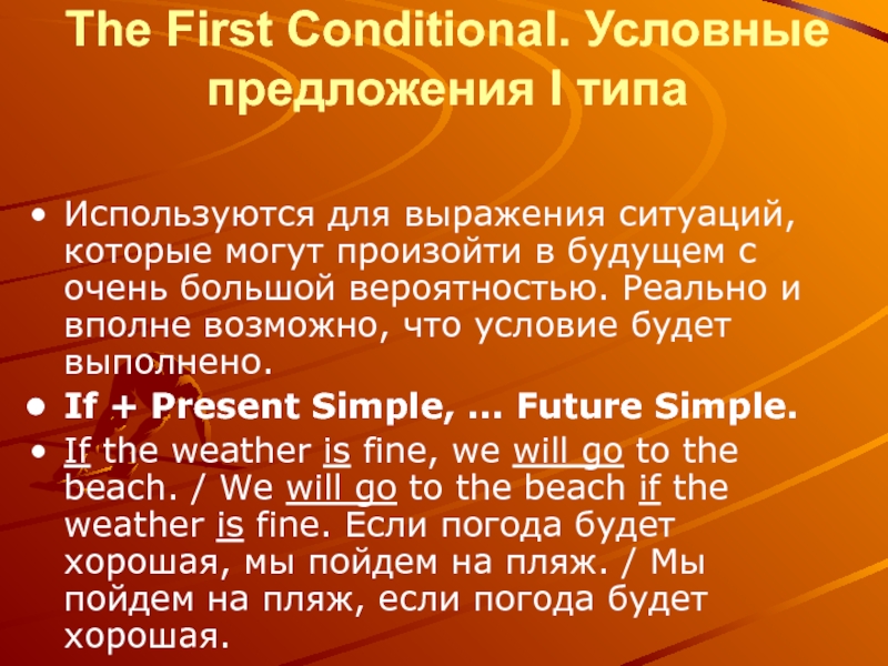 Одна из частей — это придаточное предложение с союзом if (если), содержащее условие (Если погода будет хорошая, …); другая часть — главное предложение, которое содержит результат (мы пойдем на пляж).