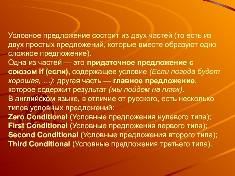 Слайд 4Условное предложение состоит из двух частей (то есть из двух простых