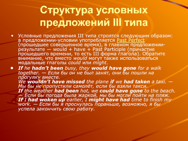 в предложении-условии употребляется Past Perfect (прошедшее совершенное время), в главном предложении-результате — would + have + Past Participle (причастие прошедшего времени, то есть III форма глагола). Обратите внимание, что вместо would могут также использоваться модальные глаголы could или might.