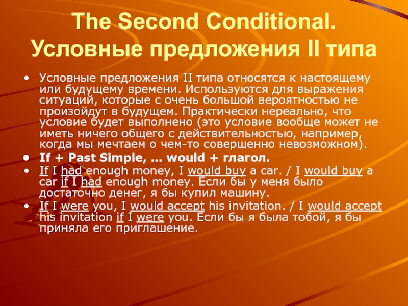 к настоящему или будущему времени. Используются для выражения ситуаций, которые с очень большой вероятностью не произойдут в будущем. Практически нереально, что условие будет выполнено (это условие вообще может не иметь ничего общего с действительностью, например, когда мы мечтаем о чем-то совершенно невозможном).