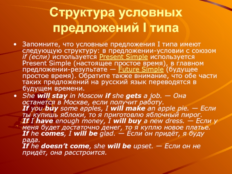 следующую структуру: в предложении-условии с союзом if (если) используется Present Simple используется Present Simple (настоящее простое время), в главном предложении-результате — Future Simple (будущее простое время). Обратите также внимание, что обе части таких предложений на русский язык переводятся в будущем времени.