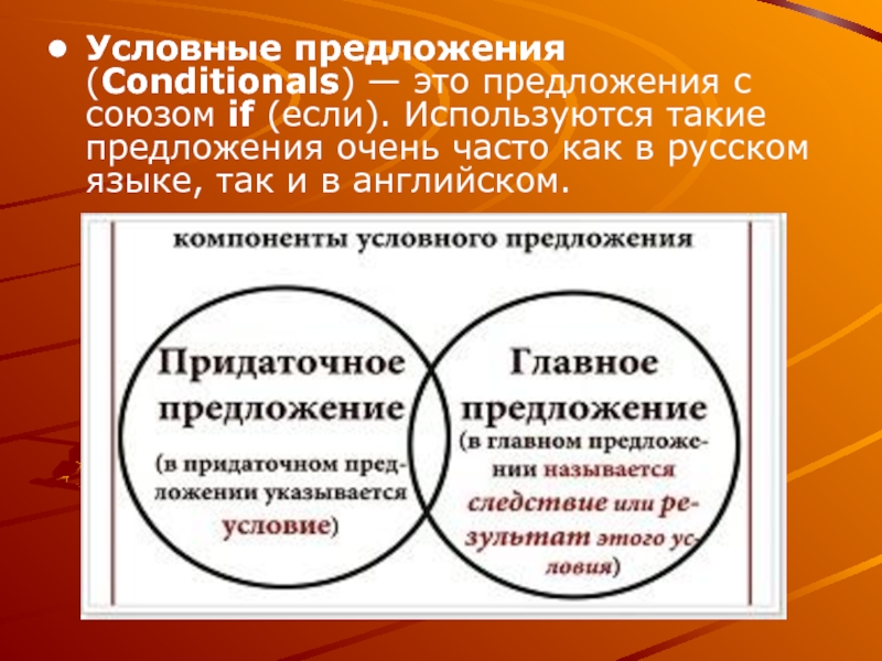Слайд 2Условные предложения (Conditionals) — это предложения с союзом if (если). Используются такие