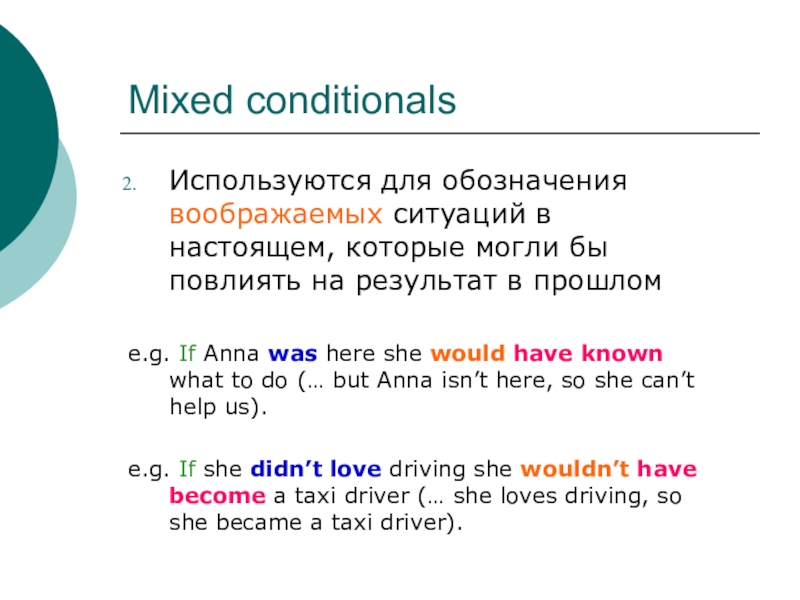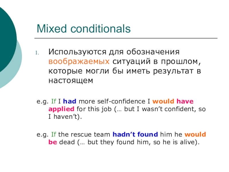 Mixed conditionalsИспользуются для обозначения воображаемых ситуаций в прошлом, которые могли бы иметь результат в настоящемe.g. If I