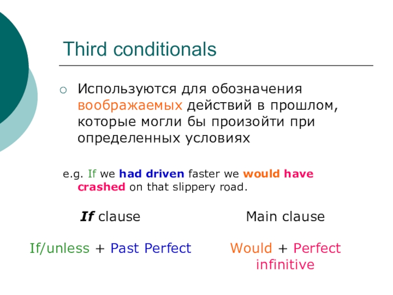 Third conditionalsИспользуются для обозначения воображаемых действий в прошлом, которые могли бы произойти при определенных условияхe.g. If we
