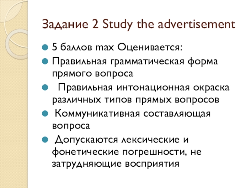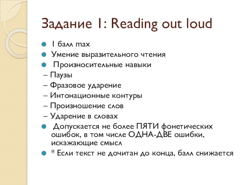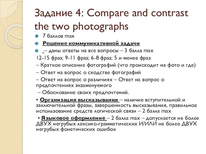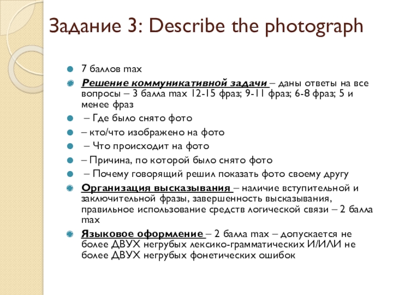 • Языковое оформление – 2 балла max – допускается не более ДВУХ негрубых лексико-грамматических И/ИЛИ не более ДВУХ негрубых фонетических ошибок