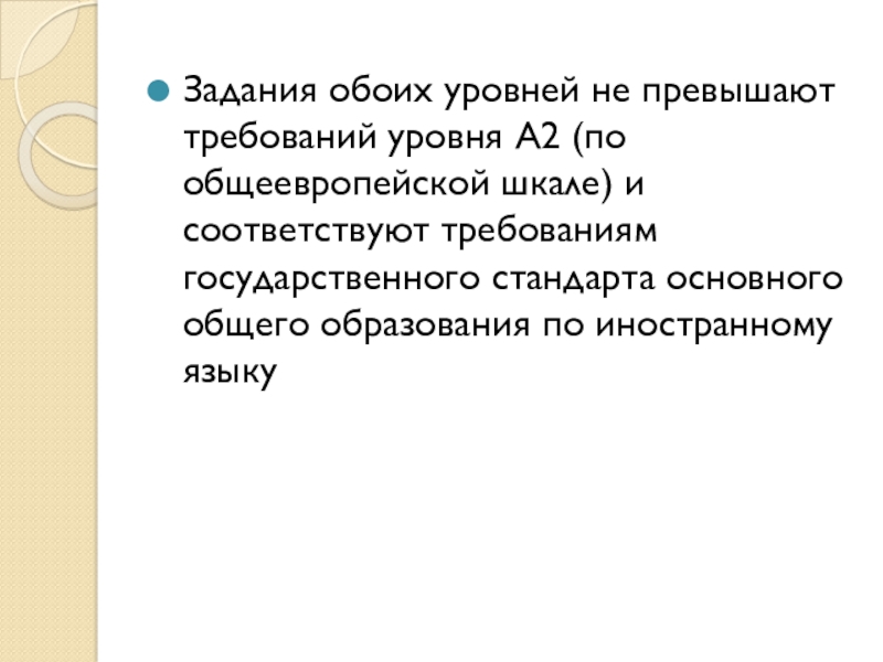 Слайд 5Задания обоих уровней не превышают требований уровня А2 (по общеевропейской шкале)