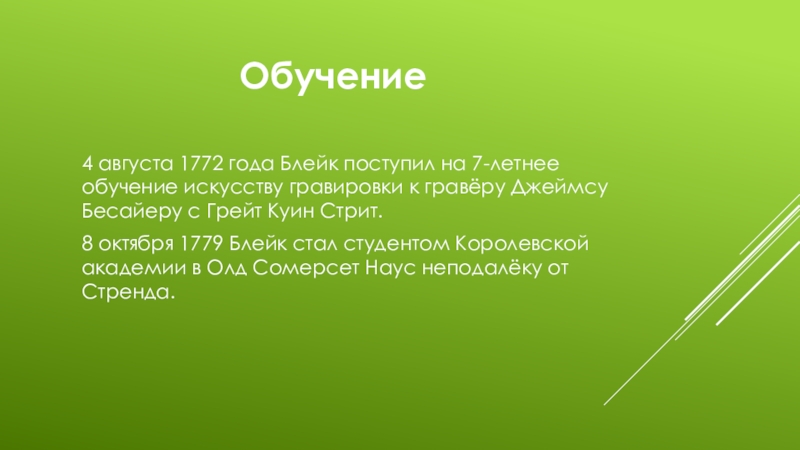 Обучение4 августа 1772 года Блейк поступил на 7-летнее обучение искусству гравировки к гравёру Джеймсу Бесайеру с Грейт