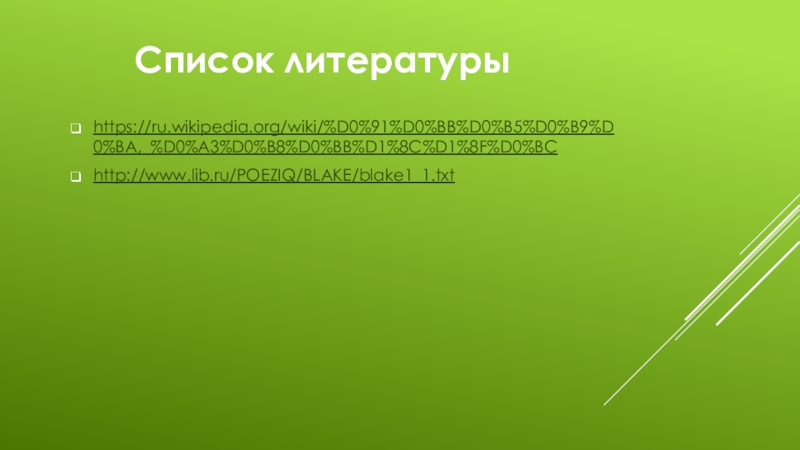 Список литературыhttps://ru.wikipedia.org/wiki/%D0%91%D0%BB%D0%B5%D0%B9%D0%BA,_%D0%A3%D0%B8%D0%BB%D1%8C%D1%8F%D0%BChttp://www.lib.ru/POEZIQ/BLAKE/blake1_1.txt