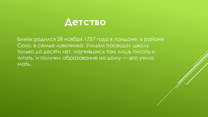 ДетствоБлейк родился 28 ноября 1757 года в Лондоне, в районе Сохо, в семье лавочника. Уильям посещал школу