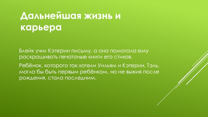 Дальнейшая жизнь и карьераБлейк учил Кэтерин письму, а она помогала ему раскрашивать печатаные книги его стихов. Ребёнок,