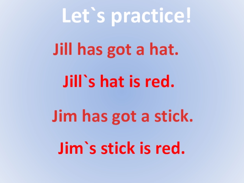 Let`s practice!Jill has got a hat.Jill`s hat is red.Jim has got a stick.Jim`s stick is red.