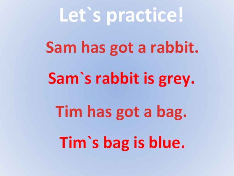 Let`s practice!Sam has got a rabbit.Sam`s rabbit is grey.Tim has got a bag.Tim`s bag is blue.