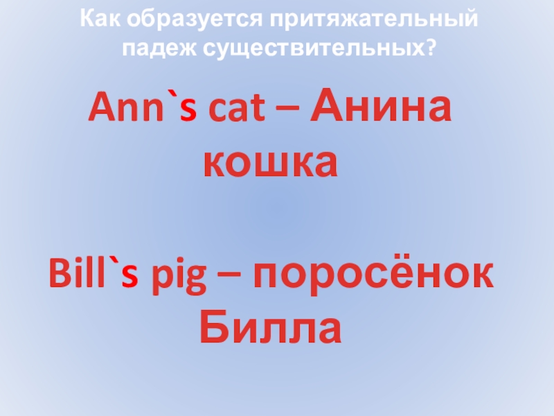 Ann`s cat – Анина кошка Bill`s pig – поросёнок Билла Как образуется притяжательныйпадеж существительных?
