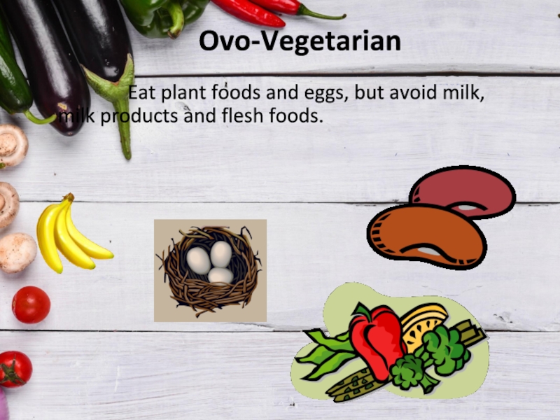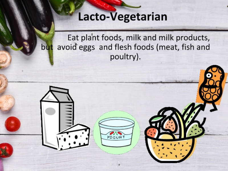 Eat plant foods, milk and milk products, but avoid eggs and flesh foods (meat, fish and poultry).