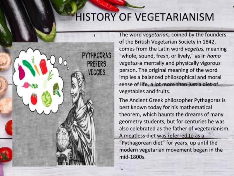 The word vegetarian, coined by the founders of the British Vegetarian Society in 1842, comes from the Latin word vegetus, meaning "whole, sound, fresh, or lively," as in homo vegetus-a mentally and physically vigorous person. The original meaning of the word implies a balanced philosophical and moral sense of life, a lot more than just a diet of vegetables and fruits.