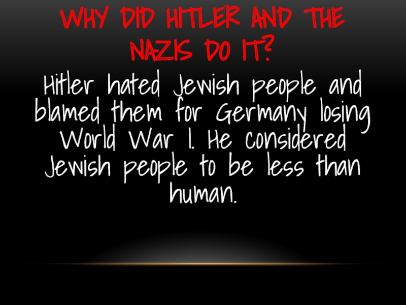 Why did Hitler and the Nazis do it?  Hitler hated Jewish people and blamed them for Germany