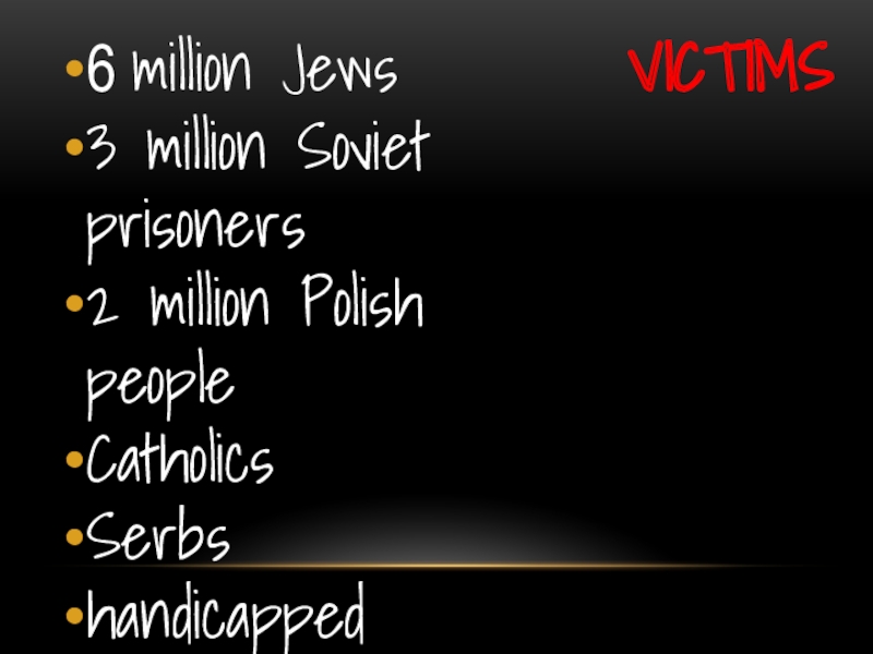 Victims6 million Jews3 million Soviet prisoners2 million Polish peopleCatholics Serbs handicapped