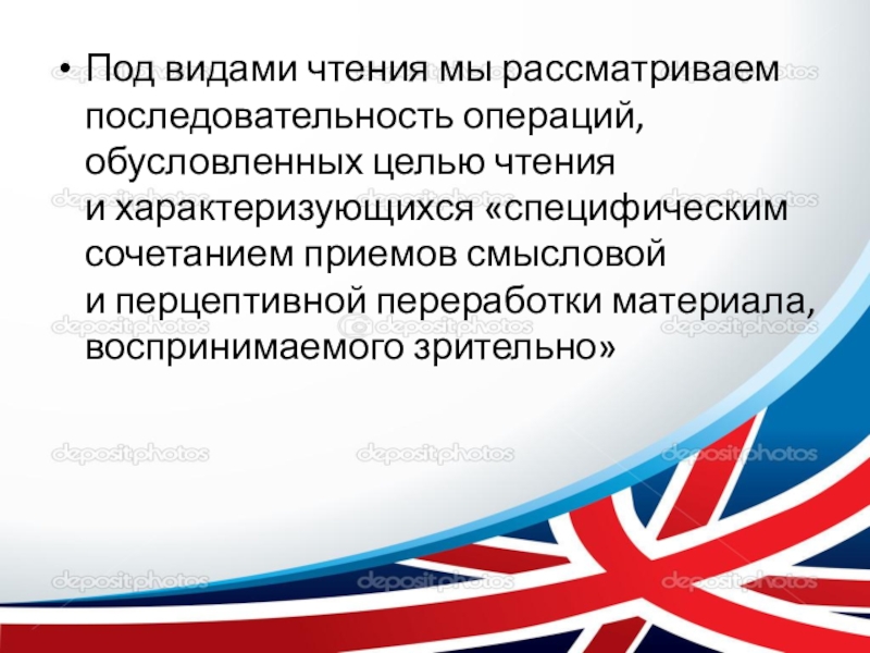 Слайд 2Под видами чтения мы рассматриваем последовательность операций, обусловленных целью чтения и характеризующихся