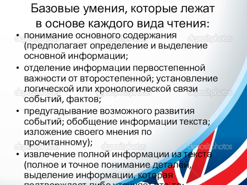Слайд 13Базовые умения, которые лежат в основе каждого вида чтения:
