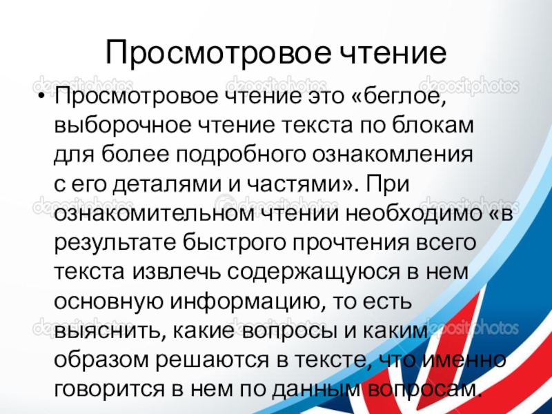 Просмотровое чтение это «беглое, выборочное чтение текста по блокам для