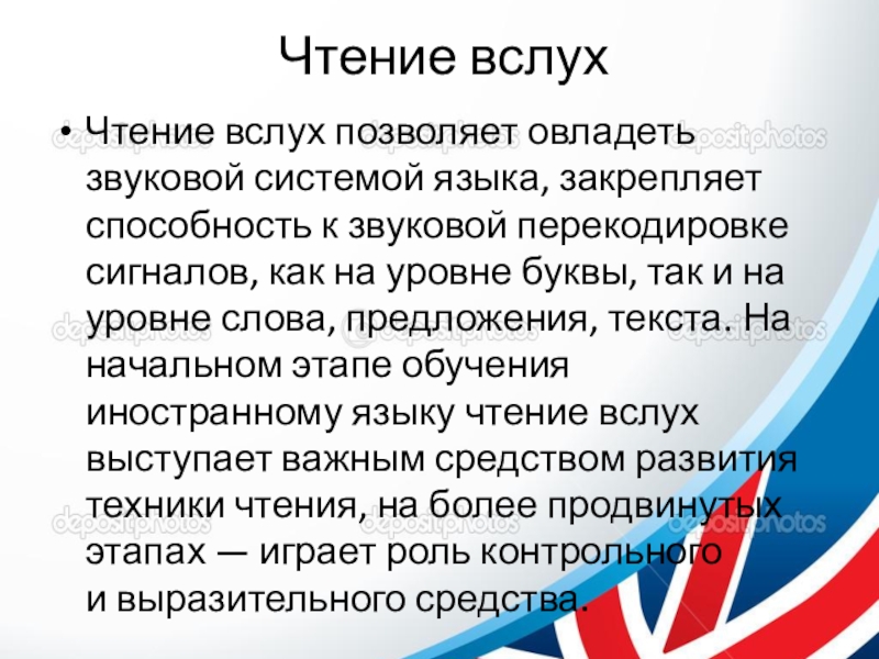 перекодировке сигналов, как на уровне буквы, так и на уровне слова, предложения, текста. На начальном этапе обучения иностранному языку чтение вслух выступает важным средством развития техники чтения, на более продвинутых этапах — играет роль контрольного и выразительного средства.
