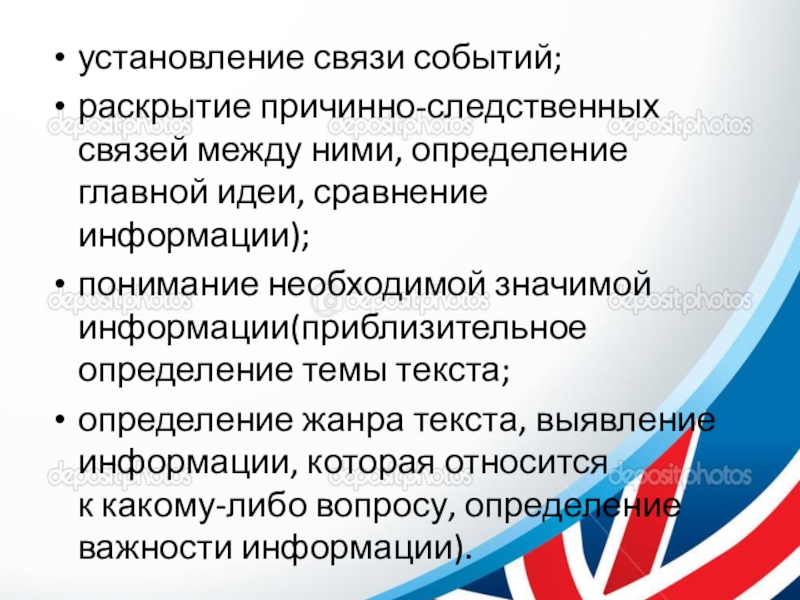 извлечение полной информации из текста(полное и точное понимание деталей, выделение информации, которая подтверждает либо уточняет что-то;