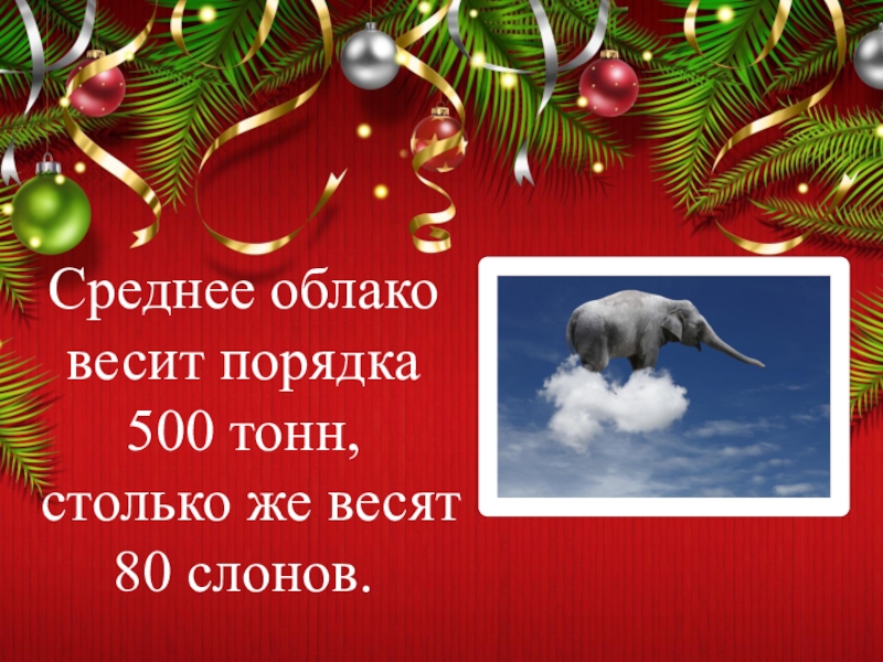 Слайд 19Среднее облако весит порядка 500 тонн, столько же весят 80 слонов.