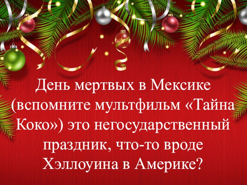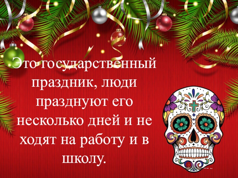 Слайд 7День мертвых в Мексике (вспомните мультфильм «Тайна Коко») это негосударственный праздник,