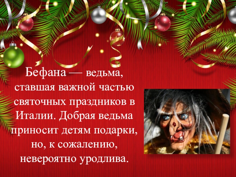 Слайд 16Бефана — ведьма, ставшая важной частью святочных праздников в Италии. Добрая