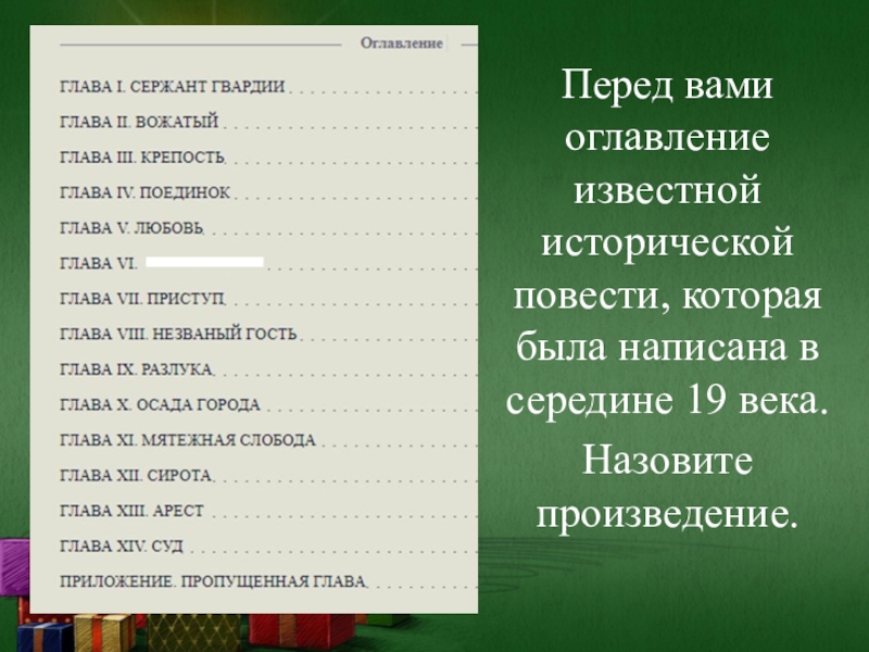 Слайд 28Перед вами оглавление известной исторической повести, которая была написана в середине