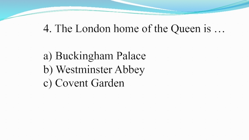 4. The London home of the Queen is … a) Buckingham Palace b) Westminster Abbey c) Covent