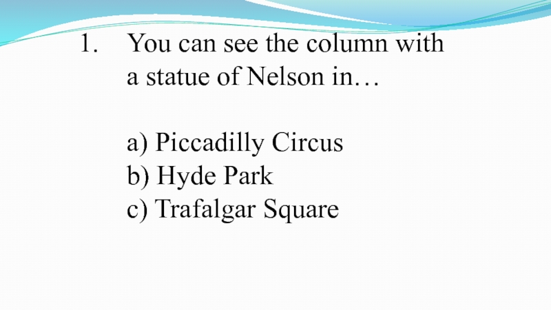You can see the column with a statue of Nelson in… a) Piccadilly Circus b) Hyde Park