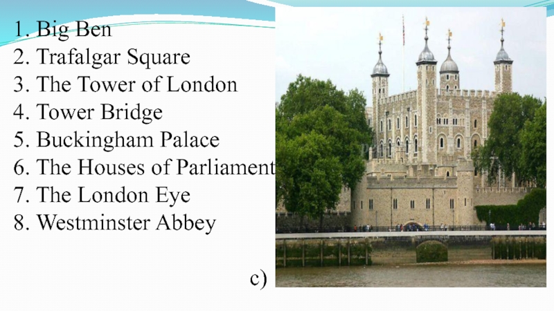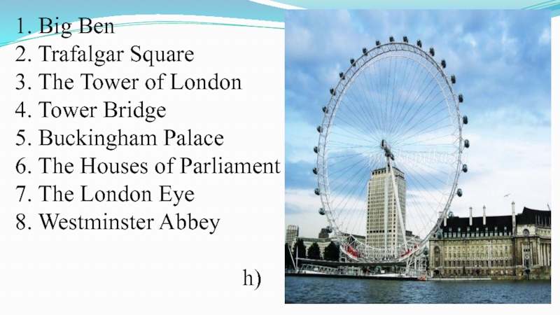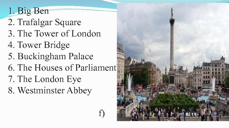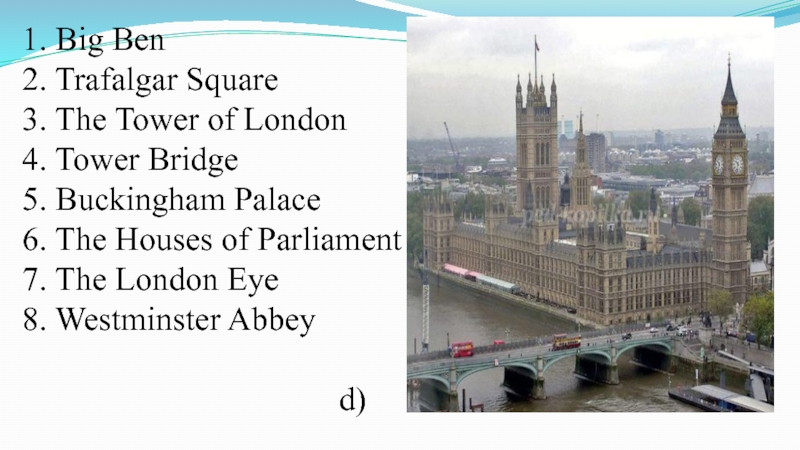 Слайд 91. Big Ben 2. Trafalgar Square 3. The Tower of London 4. Tower Bridge 5.