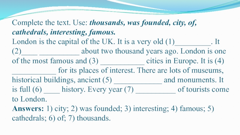 is the capital of the UK. It is a very old (1)_________. It (2)____ __________ about two thousand years ago. London is one of the most famous and (3) ___________ cities in Europe. It is (4) ___________ for its places of interest. There are lots of museums, historical buildings, ancient (5) ____________ and monuments. It is full (6) ____ history. Every year (7) __________ of tourists come to London. Answers: 1) city; 2) was founded; 3) interesting; 4) famous; 5) cathedrals; 6) of; 7) thousands.