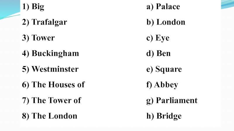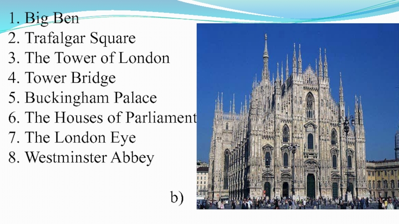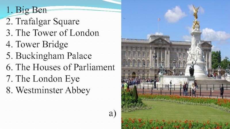 Слайд 71. Big Ben 2. Trafalgar Square 3. The Tower of London 4. Tower Bridge 5.