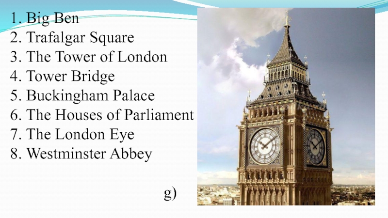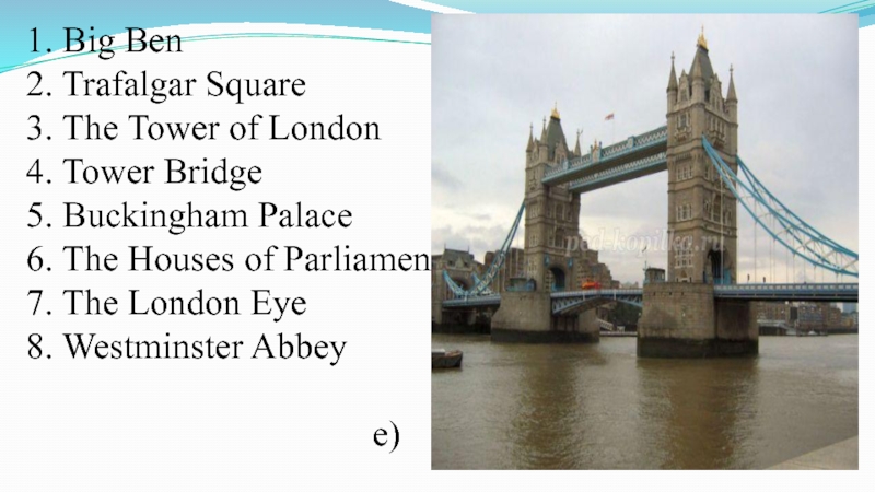 Слайд 81. Big Ben 2. Trafalgar Square 3. The Tower of London 4. Tower Bridge 5.