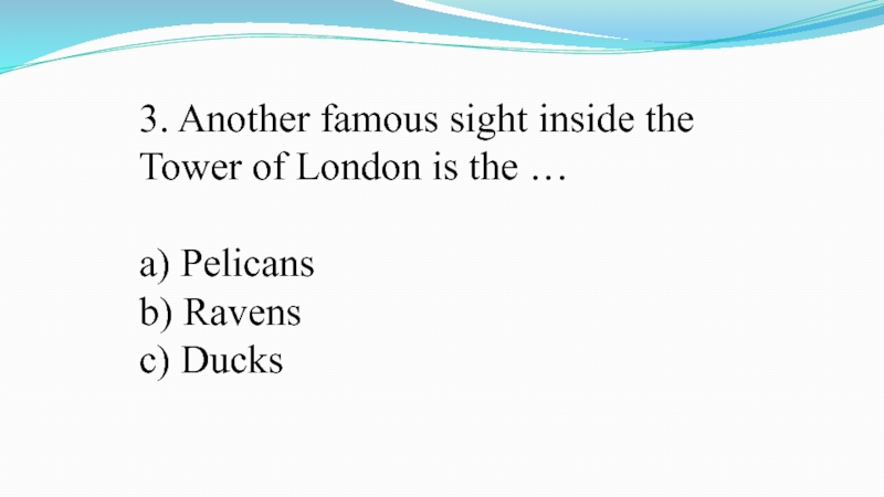3. Another famous sight inside the Tower of London is the … a) Pelicans b) Ravens c)
