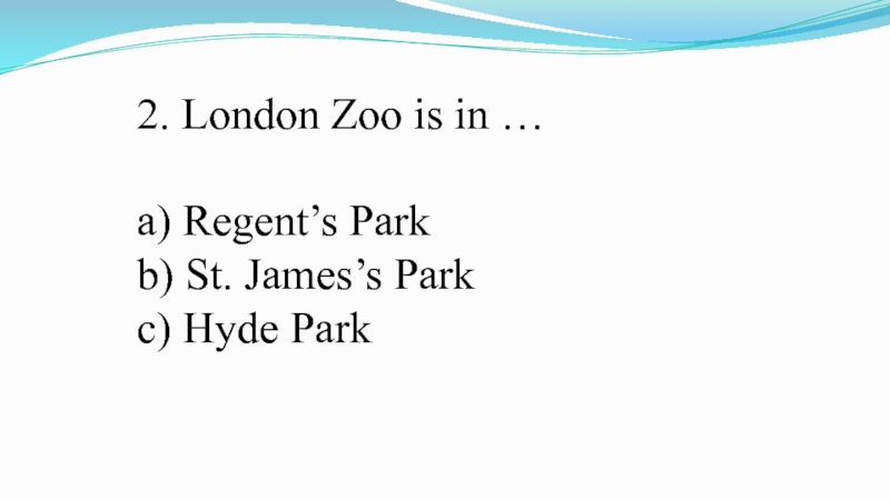 2. London Zoo is in … a) Regent’s Park b) St. James’s Park c) Hyde Park