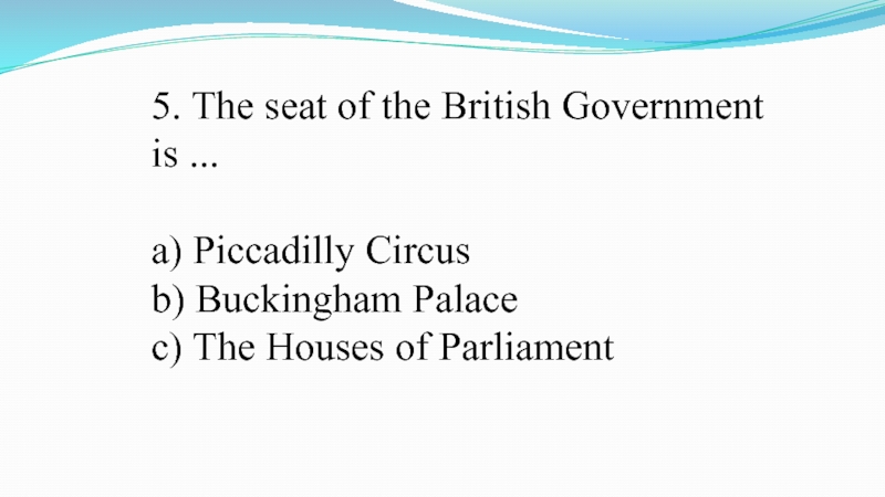5. The seat of the British Government is ... a) Piccadilly Circus b) Buckingham Palace c) The
