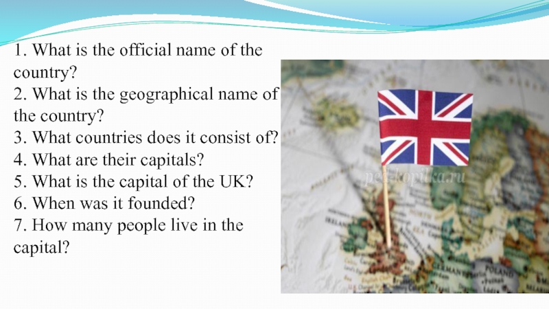 the geographical name of the country?  3. What countries does it consist of? 4. What are their capitals? 5. What is the capital of the UK? 6. When was it founded? 7. How many people live in the capital?