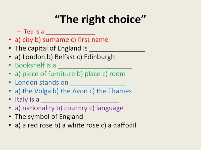 “The right choice”Ted is a _______________a) city b) surname c) first nameThe capital of England is _______________a)